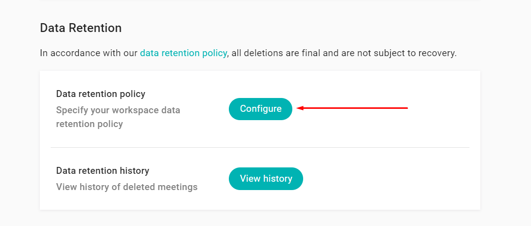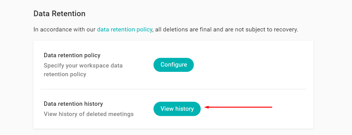 - In your Sembly account, in settings, open Workspace details, scroll down, and find the "Data Retention history"