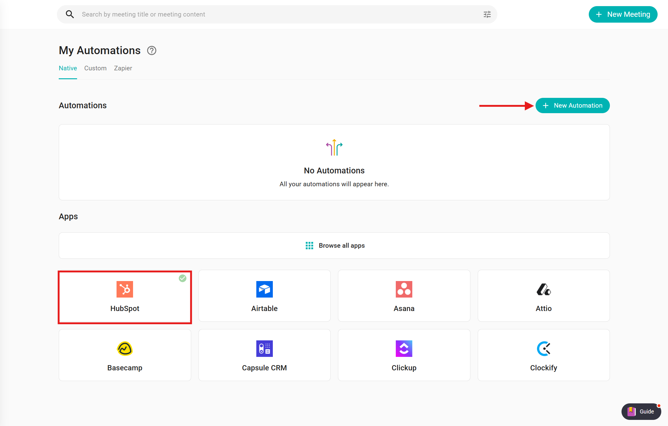 To add Automation, select the connected app and then click “+New Automation” in the pop-up, or click “+New Automation” and select the connected app on the page