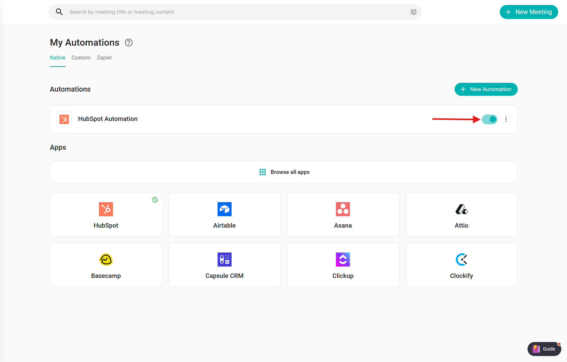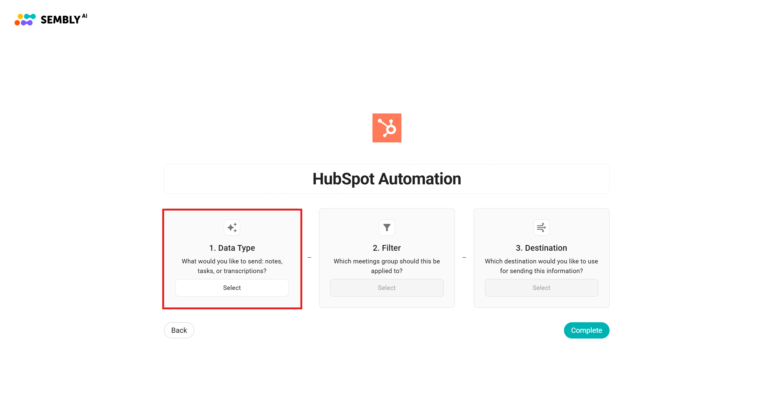Automation is a rule that contains specific information about the place you want to send meeting data from Sembly to any other app. One app can have a set of Automation rules based on your use case. For HubSpot, you can send Transcriptions, Notes, and Tasks from Sembly to different contacts. Therefore, you need to create 3 automations, one for Notes, one for Transcriptions, and one for Tasks.