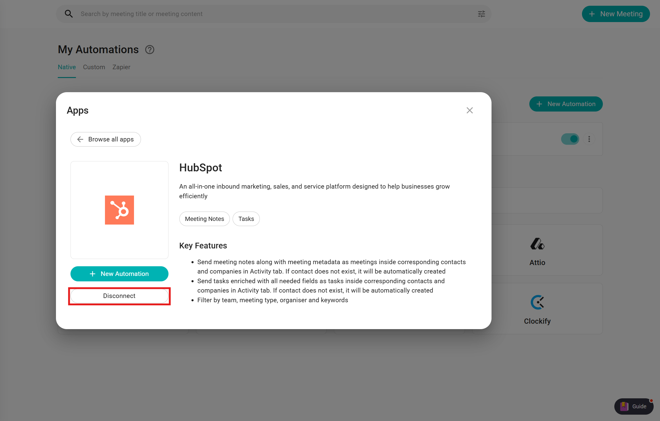To disconnect the app, you just need to click on HubSpot, and in the next window, click Disconnect