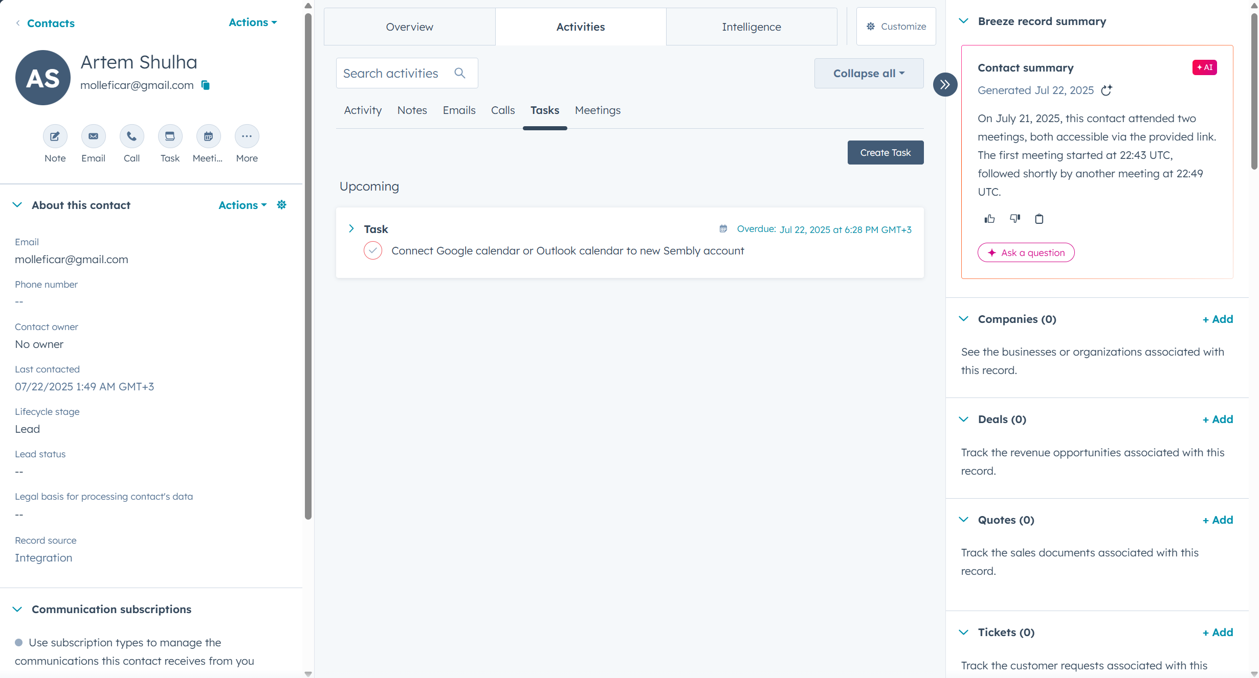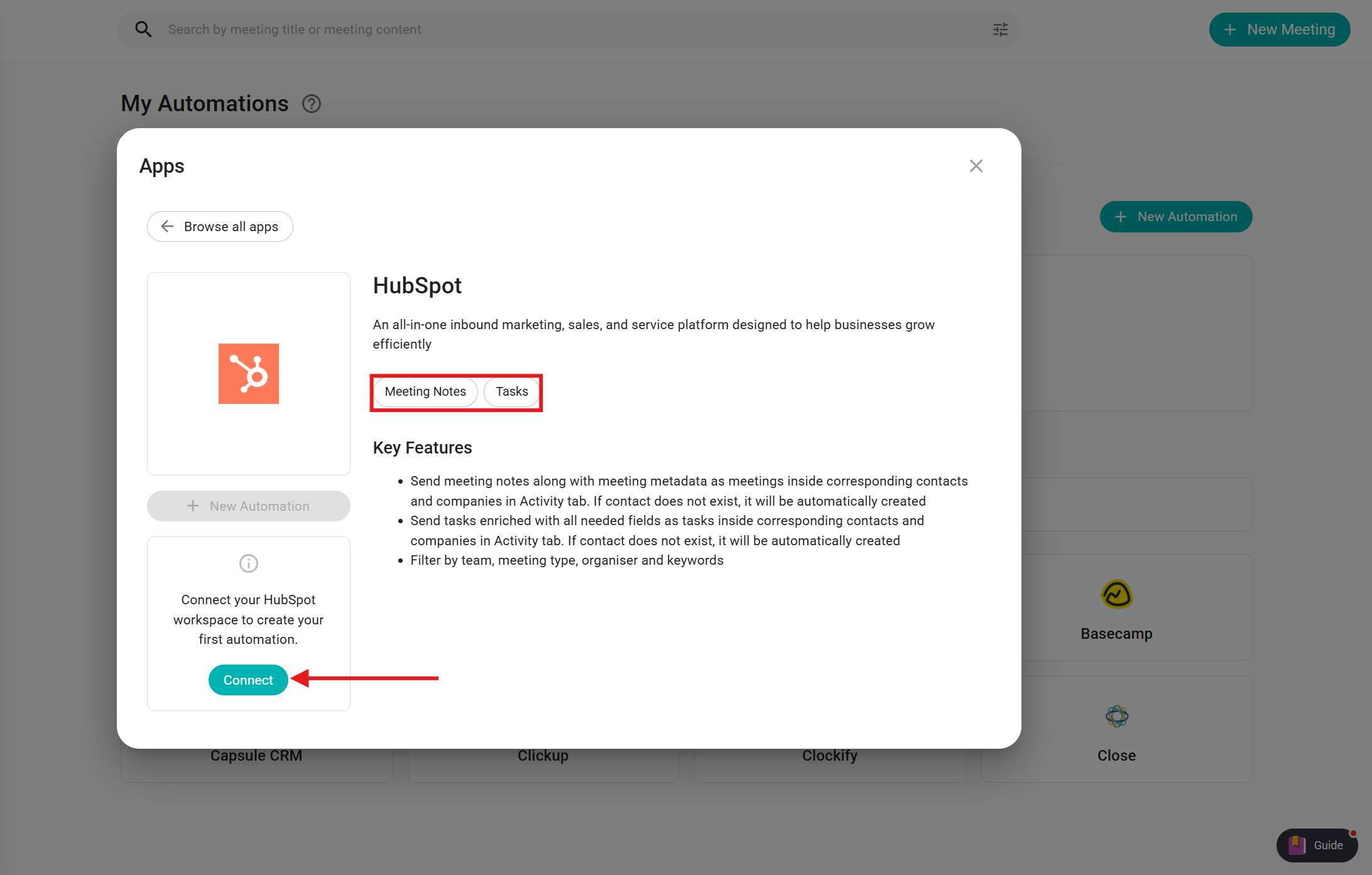 Sembly allows you to automatically send Meeting Notes, Transcriptions, or Tasks from your meetings to HubSpot. This is useful for logging conversations, following up with leads, and streamlining your sales and support workflows.