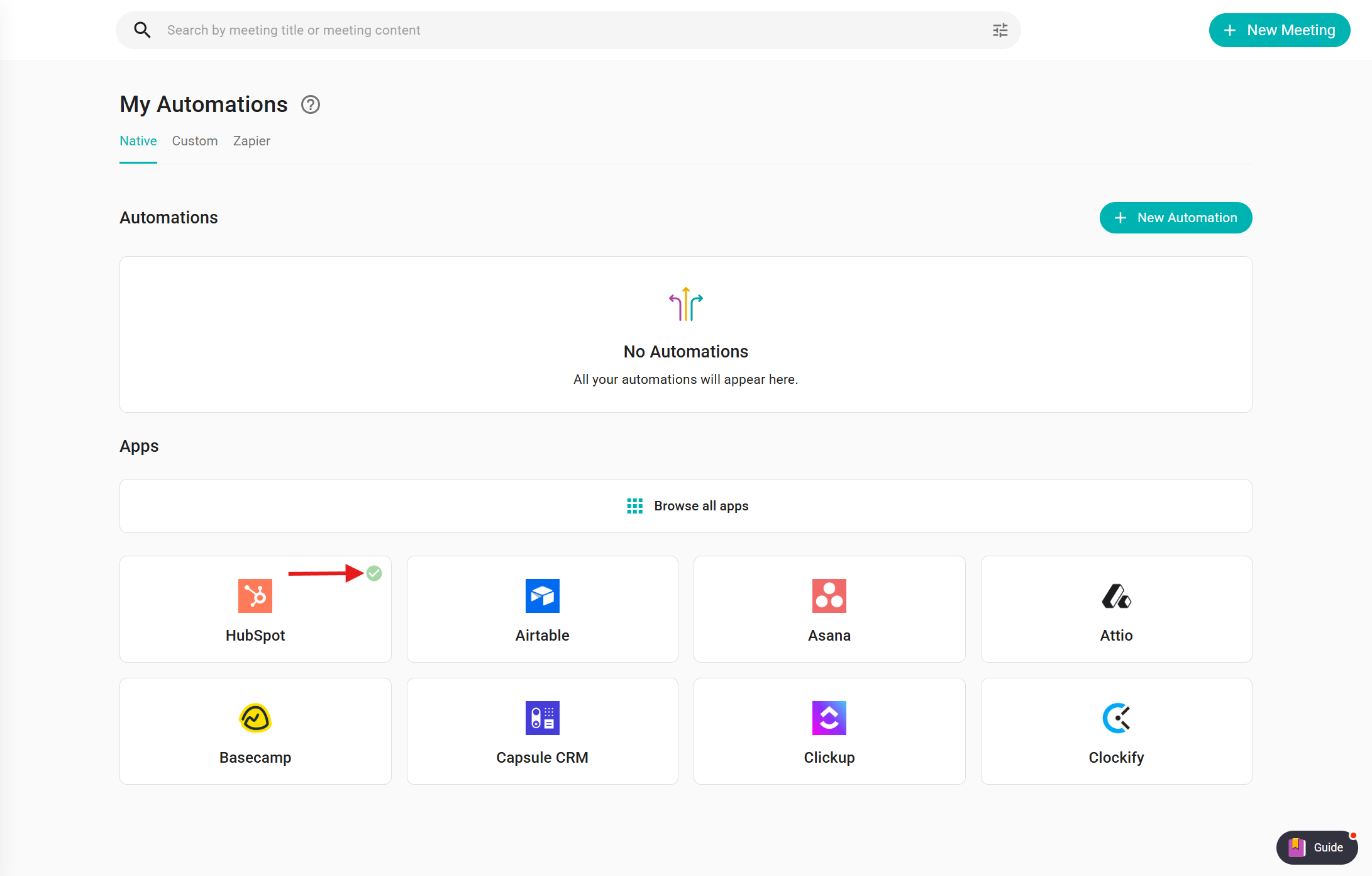 - Open Personal or Workspace Automations, find HubSpot, and click on it