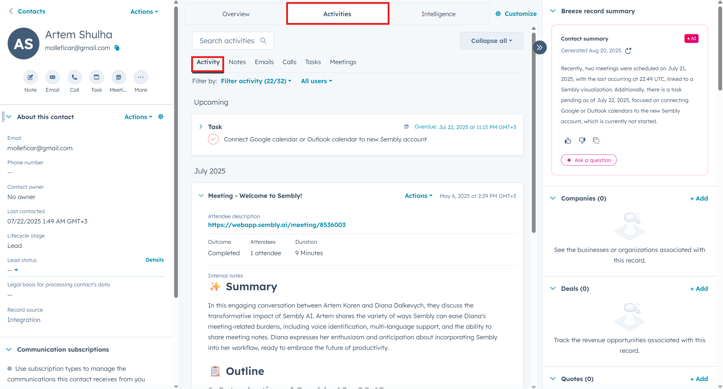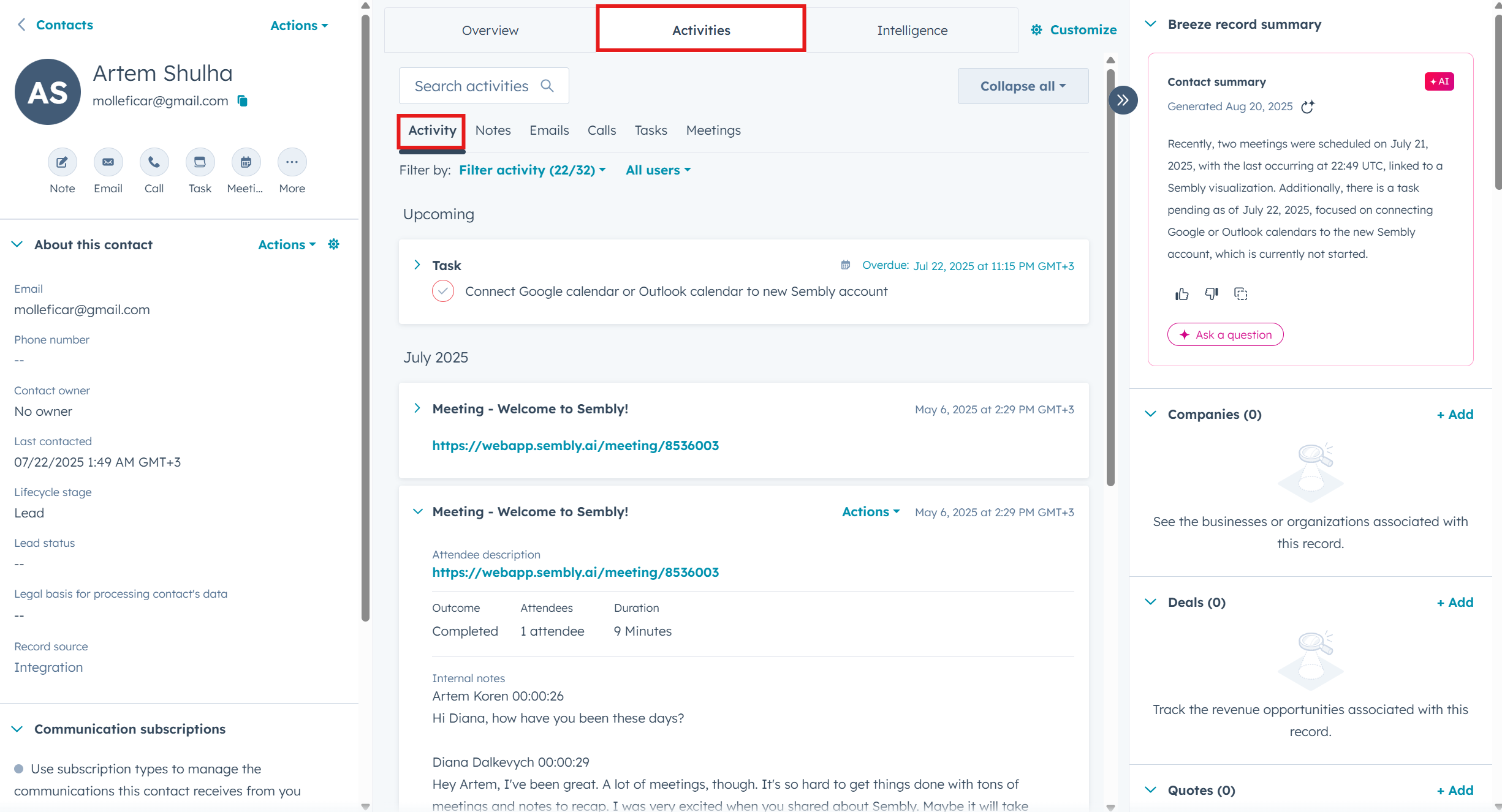 Meeting notes – added as meetings in the Activity tab of the corresponding contacts and companies. If the contact does not exist, it will be created automatically.