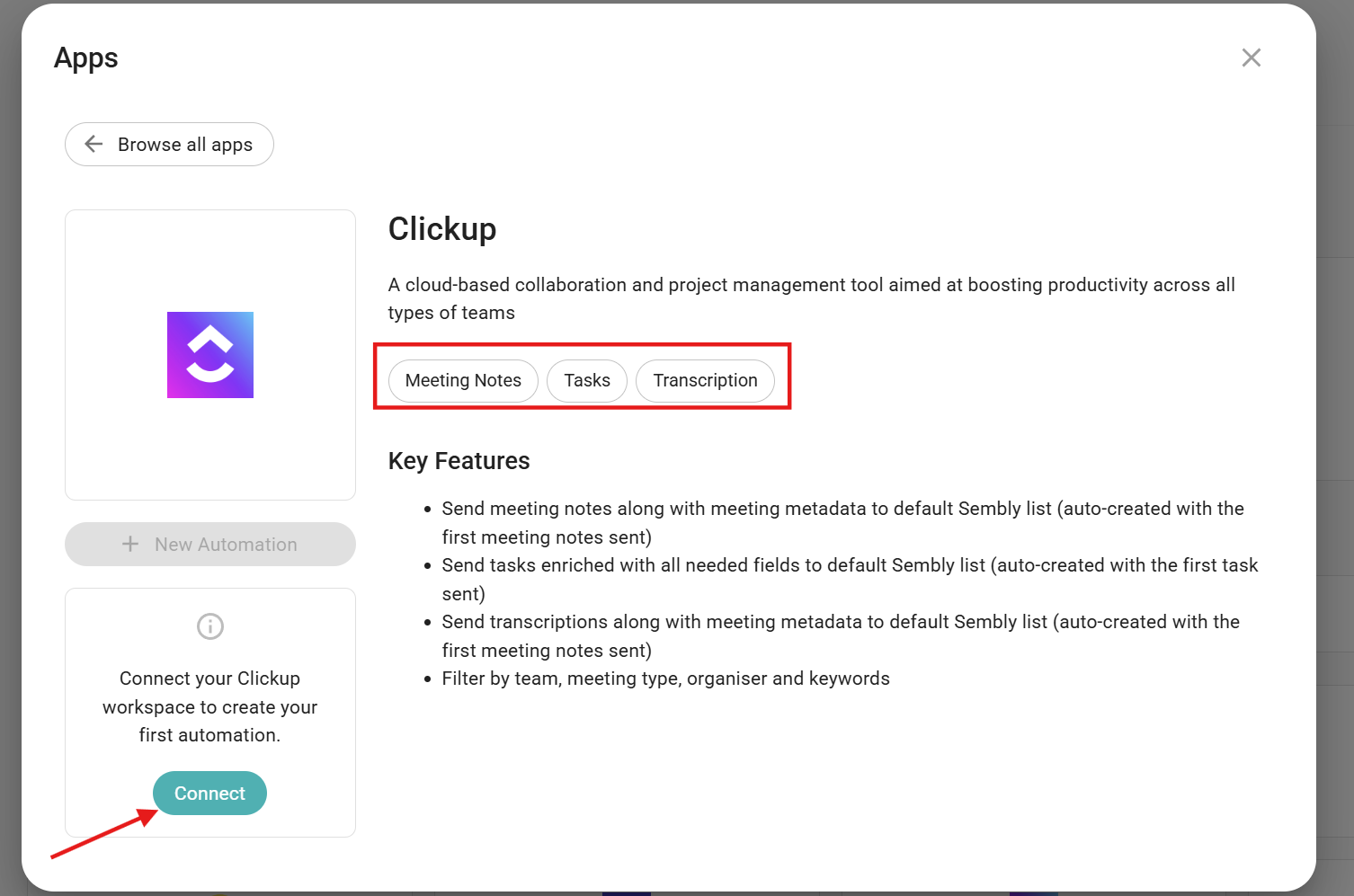 Sembly allows you to automatically send Meeting Notes, Transcriptions, or Tasks from your meetings to ClickUp. This is useful for capturing meeting insights, creating action items, and keeping tasks organized directly in ClickUp — helping teams stay aligned and streamline their project and support workflows.