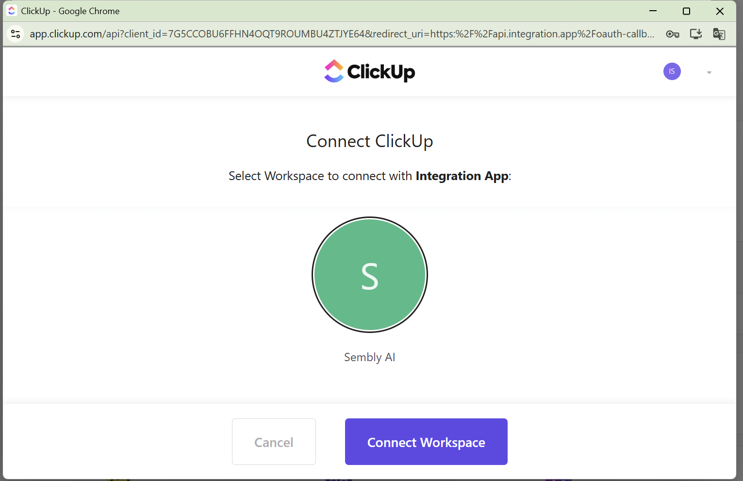 Once you click "Connect", a new webpage will pop up offering you to choose which Clickup account you want to connect your Sembly account to