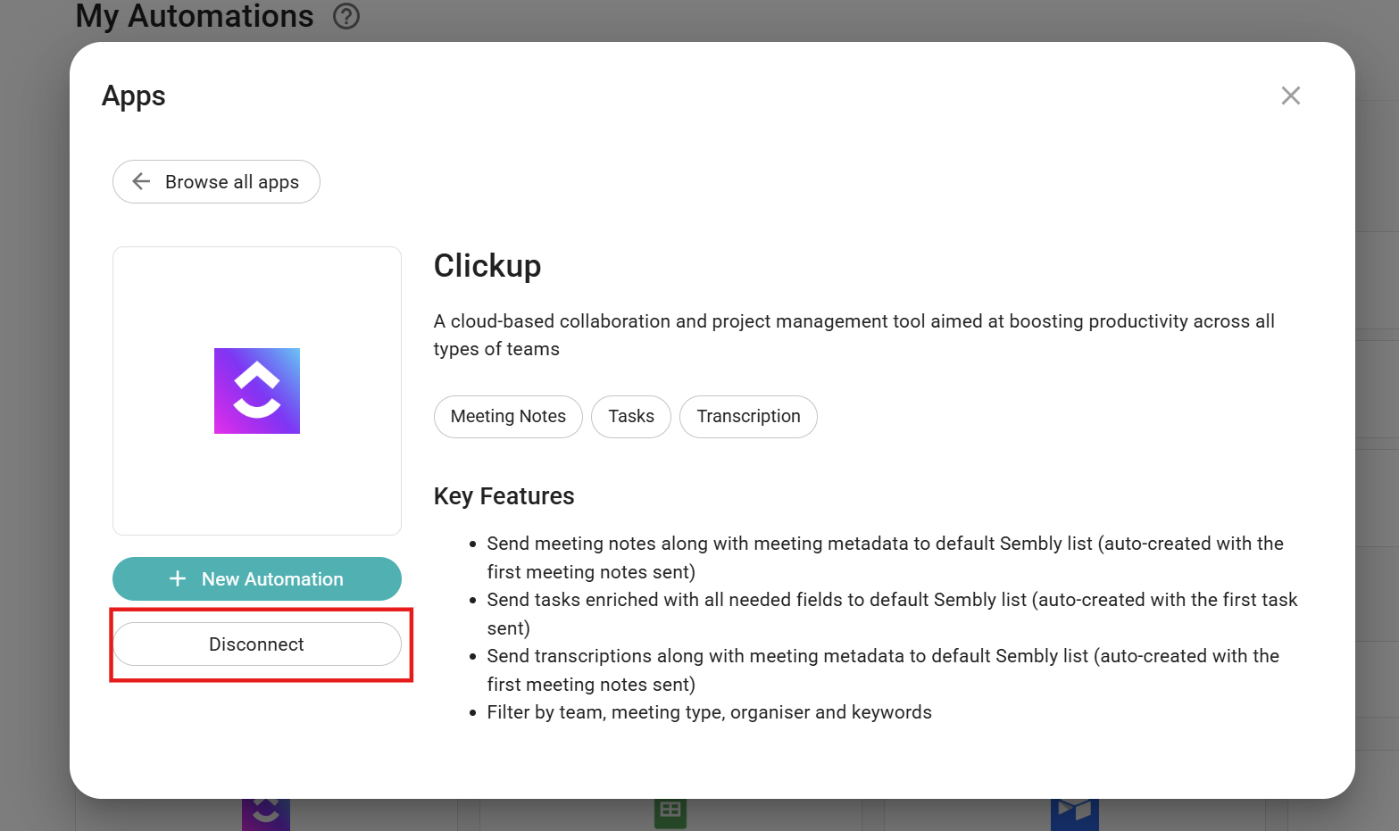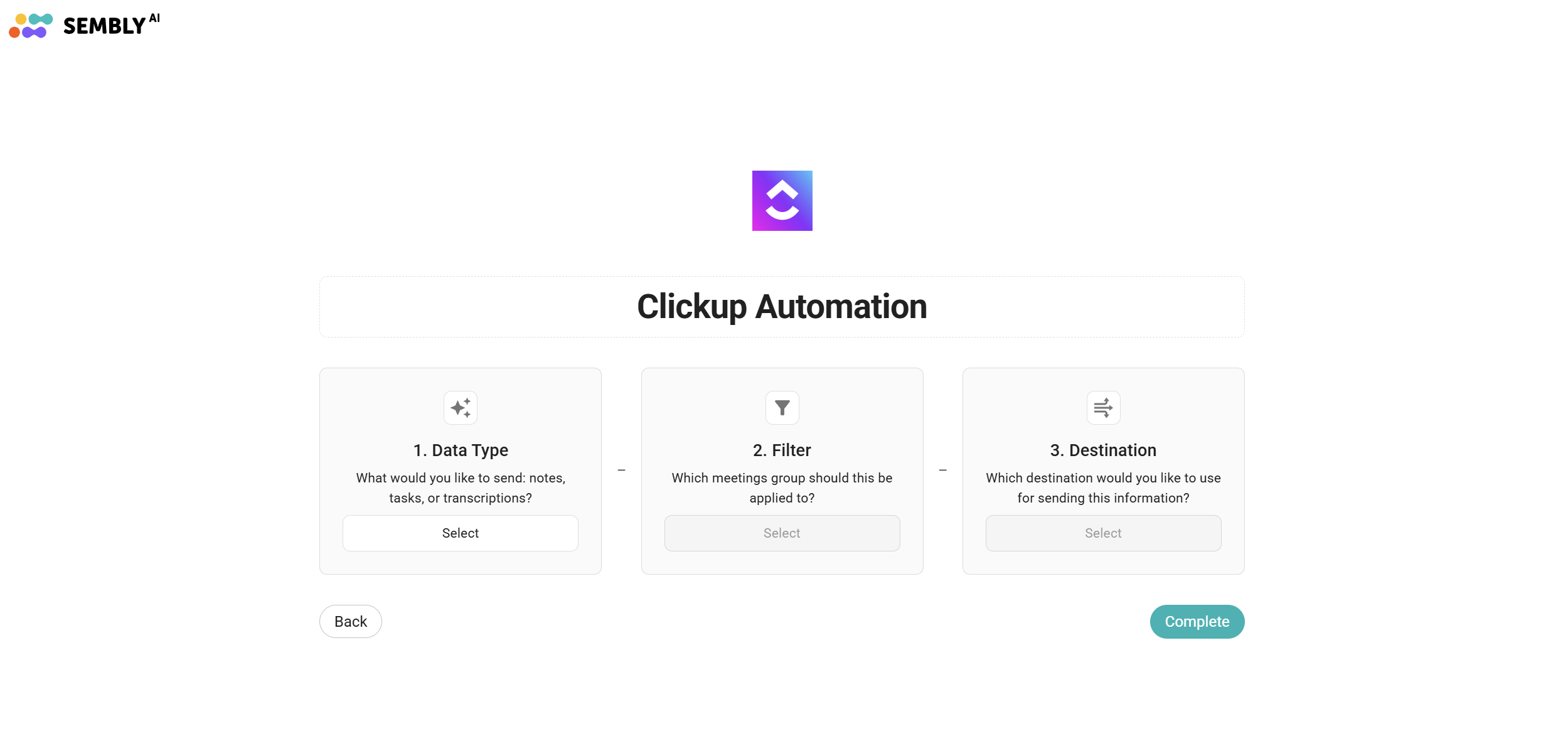 Automation is a rule that contains specific information about the place you want to send meeting data from Sembly to any other app. One app can have a set of Automation rules based on your use case. For ClickUp, you can send Transcriptions, Notes, and Tasks from Sembly to different tabs. Therefore, you need to create 3 automations, one for Notes, one for Transcriptions, and one for Tasks.