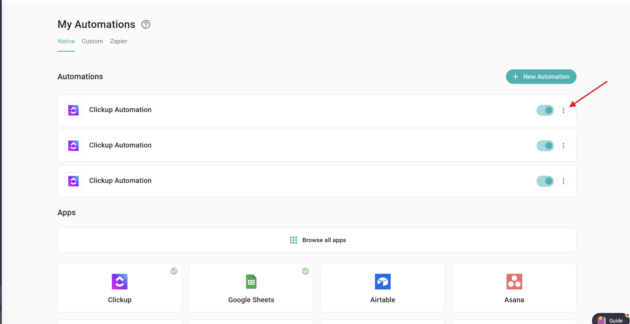 - Open Personal or Workspace Automations, find ClickUp, and click on it