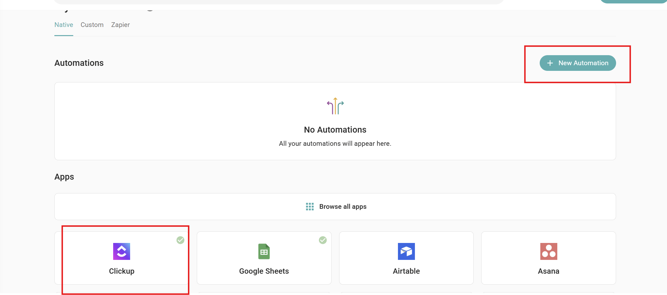 To add Automation, select the connected app and then click “+New Automation” in the pop-up, or click “+New Automation” and select the connected app on the page