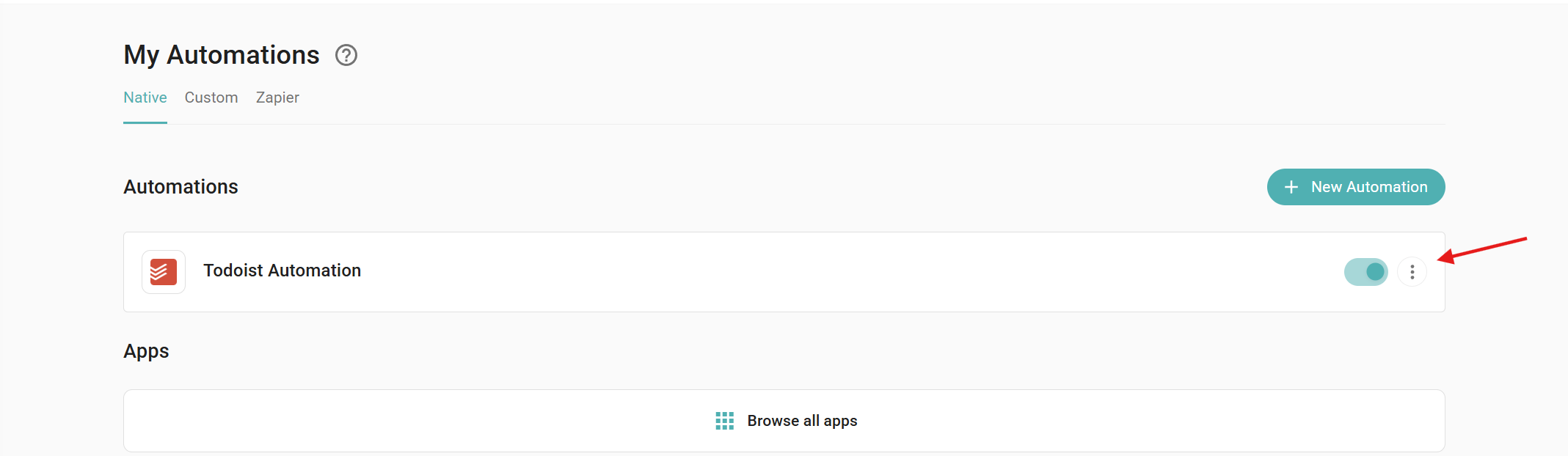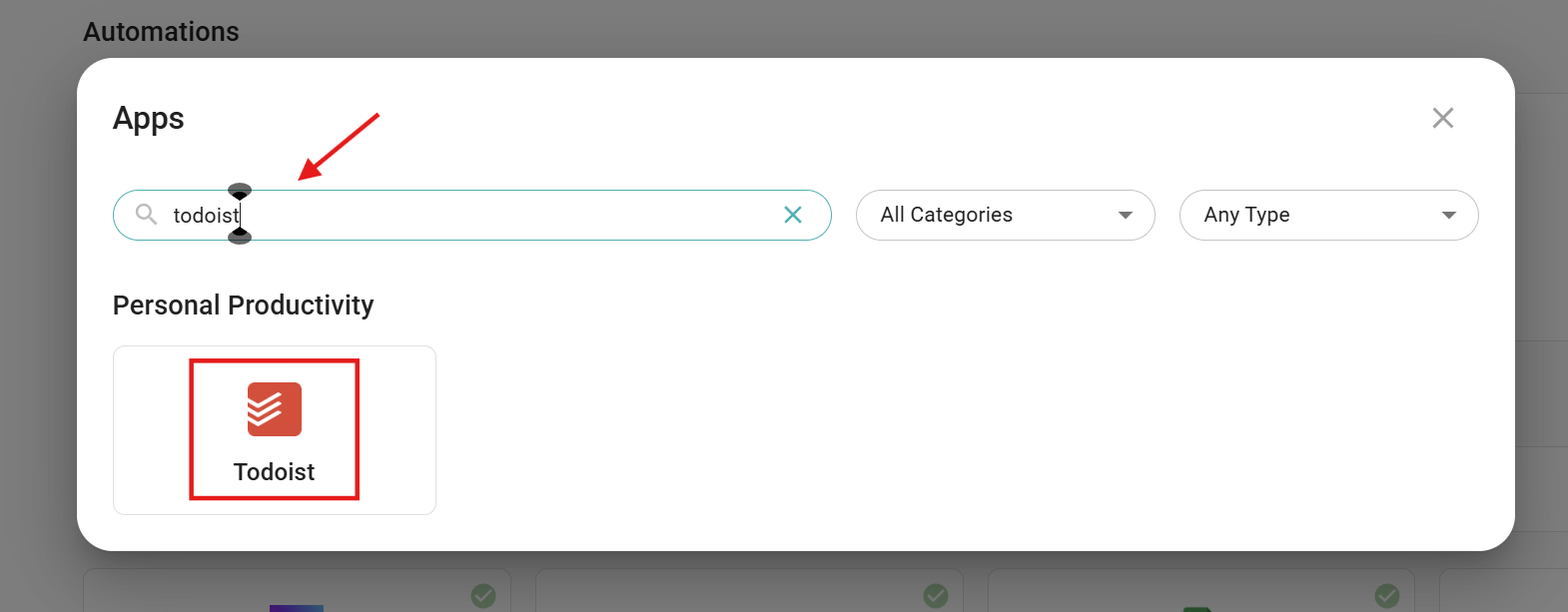 - Open Personal or Workspace Automations, find Todoist, and click on it
