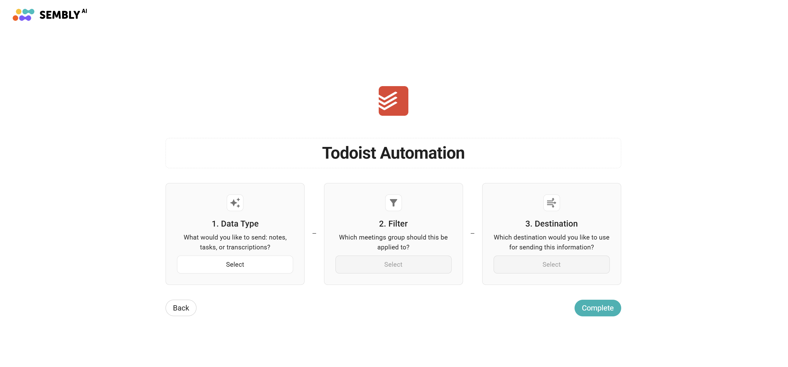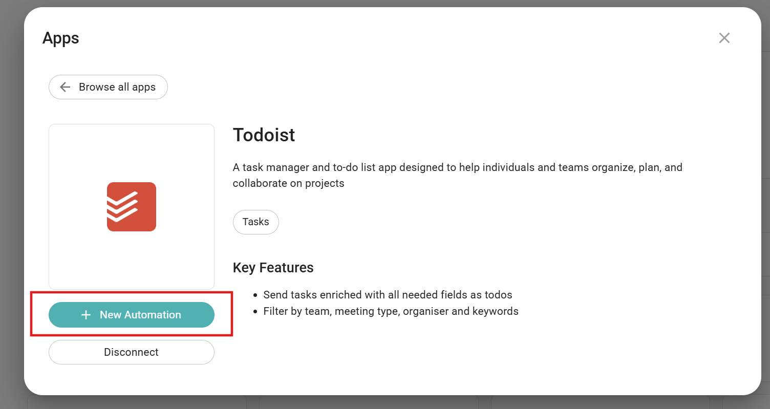Automation is a rule that contains specific information about the place you want to send meeting data from Sembly to any other app. One app can have a set of Automation rules based on your use case. For Todoist, you can send Tasks from Sembly to a new tab. Therefore, you need to create 1 automation - for Tasks.