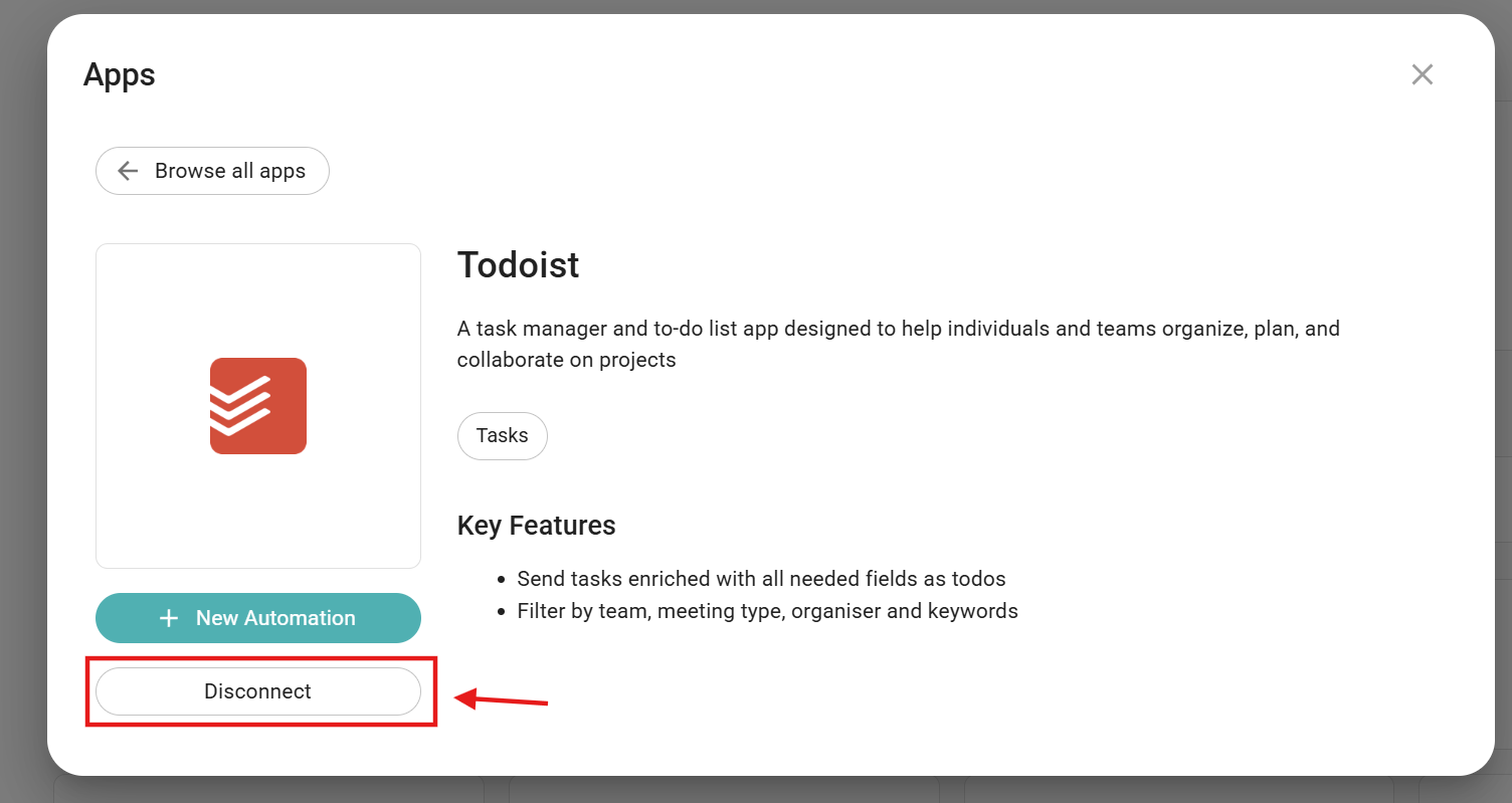 To disconnect the app, you just need to click on Todoist, and in the next window, click Disconnect