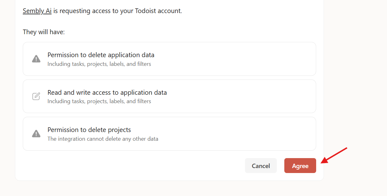After choosing your Account, you will be asked to Agree to provide Sembly access to your Todoist account