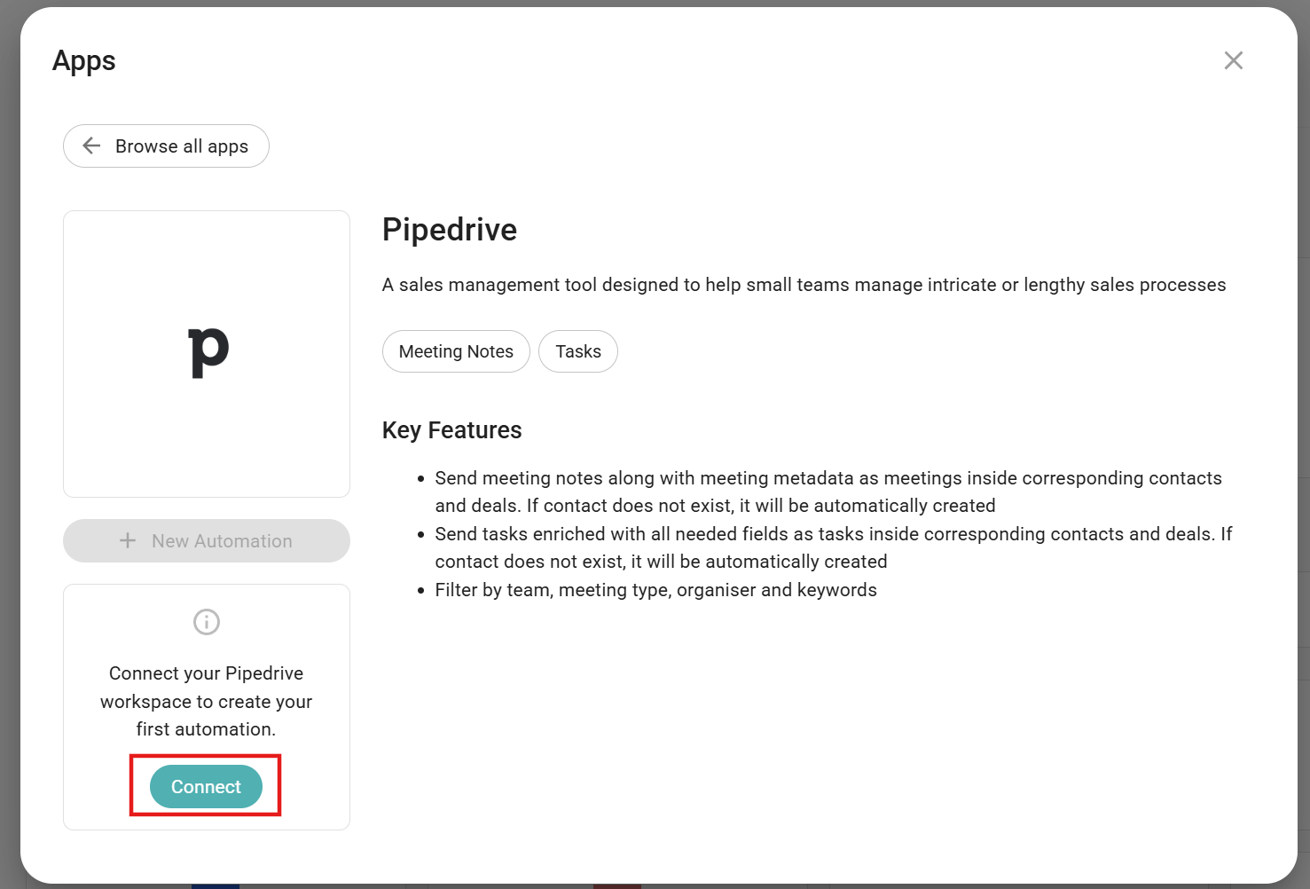 Sembly allows you to automatically send Meeting Notes or Transcriptions from your meetings to Pipedrive. This is useful for logging conversations, updating deal records, and ensuring your sales pipeline stays current with the latest customer interactions.