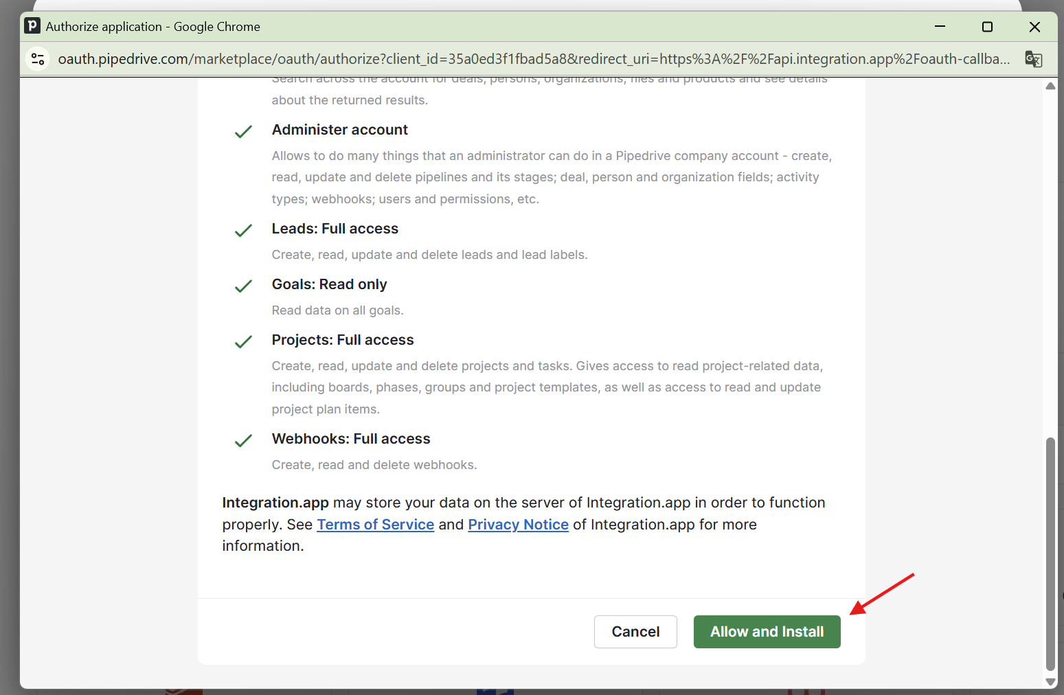 After logging in, you will be asked to add Integration.app to connect with Pipedrive and Sembly