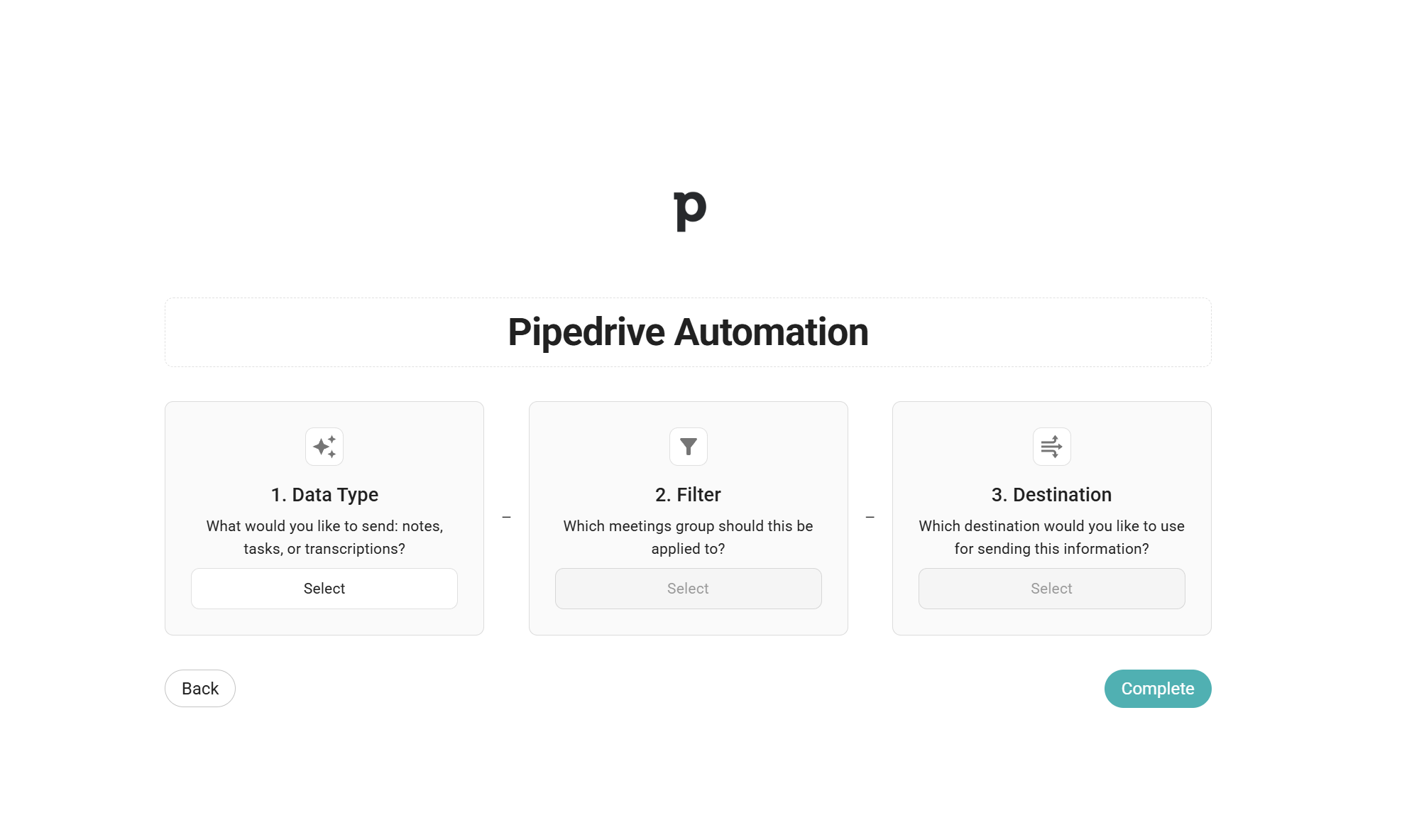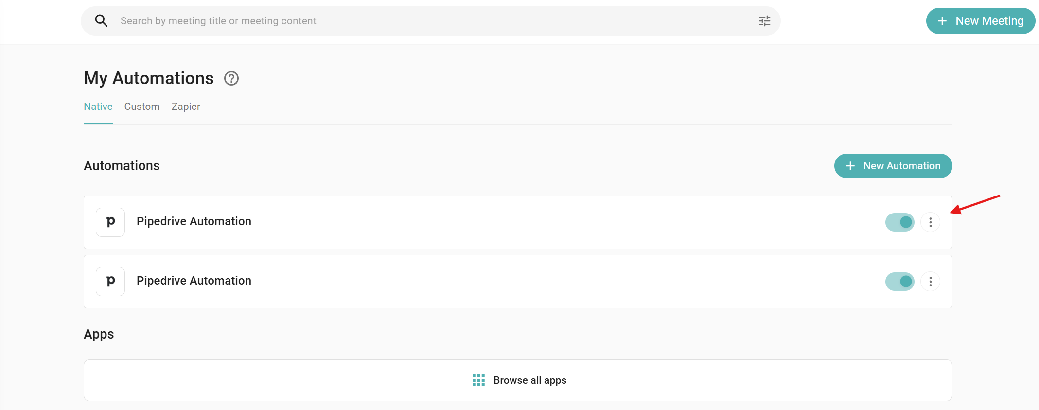 Automation is a rule that contains specific information about the place you want to send meeting data from Sembly to any other app. One app can have a set of Automation rules based on your use case. For Pipedrive, you can send Transcriptions, and Meeting Notes from Sembly to different tabs. Therefore, you need to create 2 automations, one for Notes, one for Transcriptions.