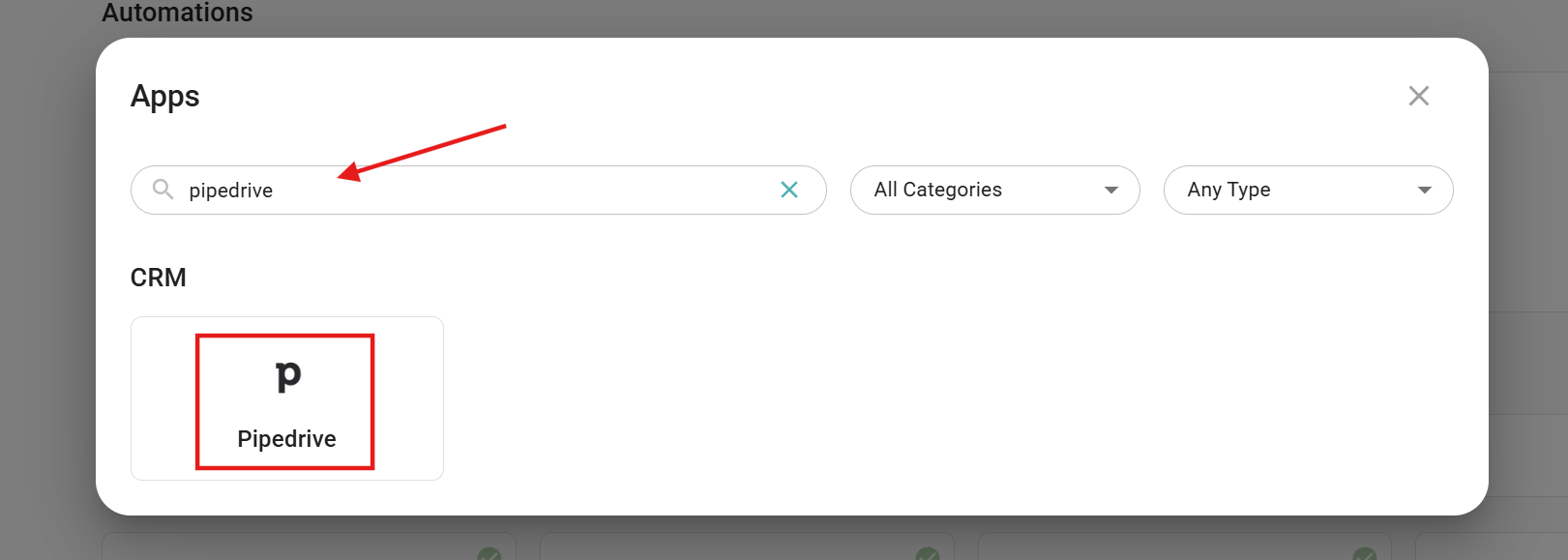 Then, you can find Pipedrive in the CRM category or simply find it using the “Search” field