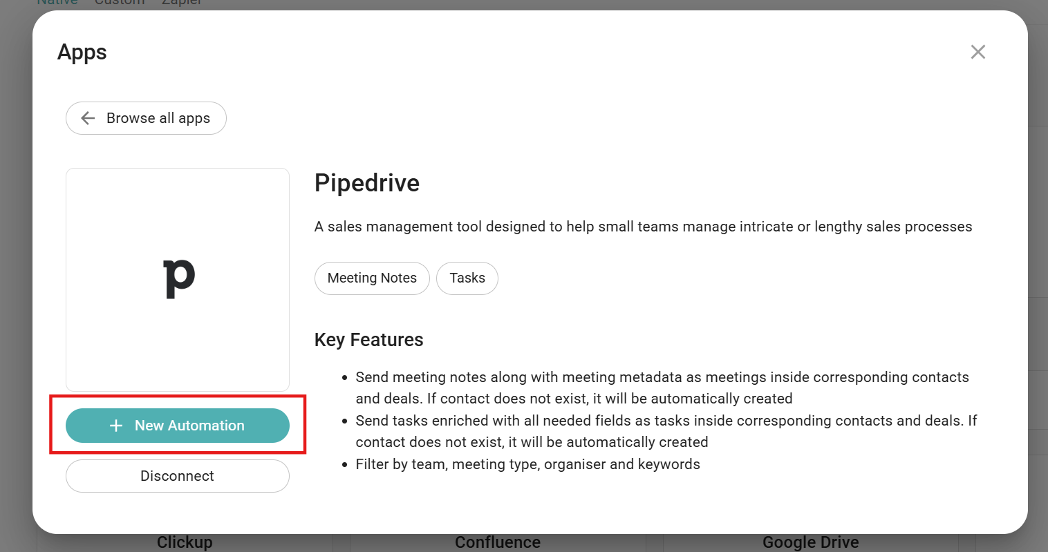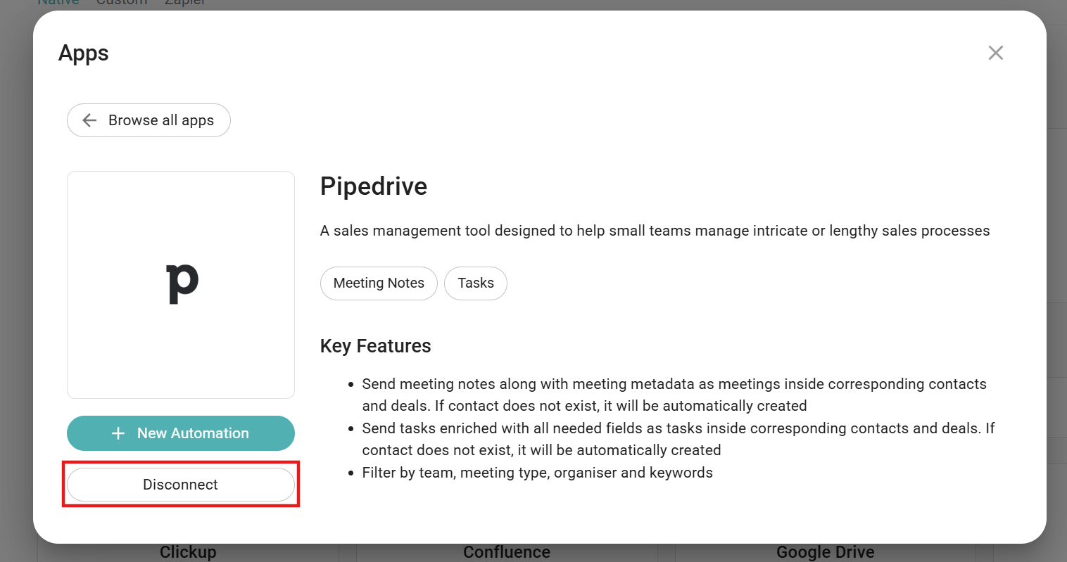 To disconnect the app, you just need to click on Pipedrive, and in the next window, click Disconnect