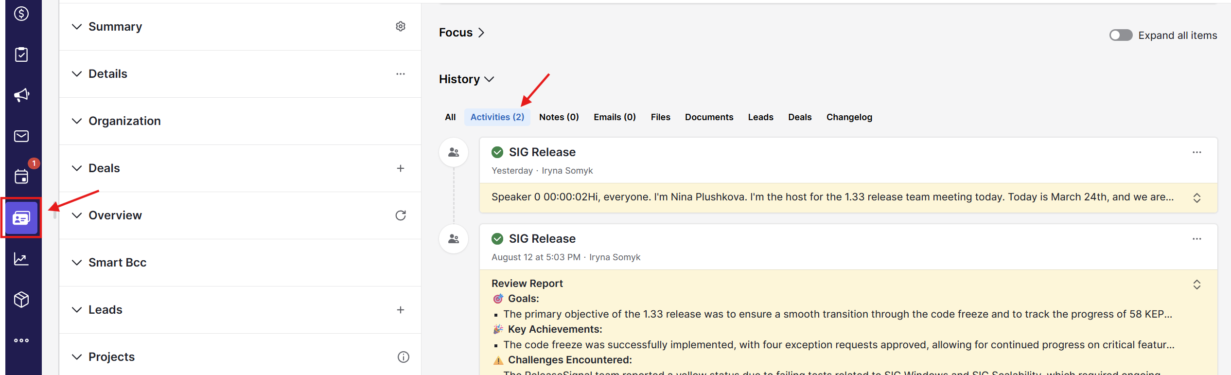 Meeting notes – are sent to the Activities, in the Contacts tab. A new activity is created once you push the data.