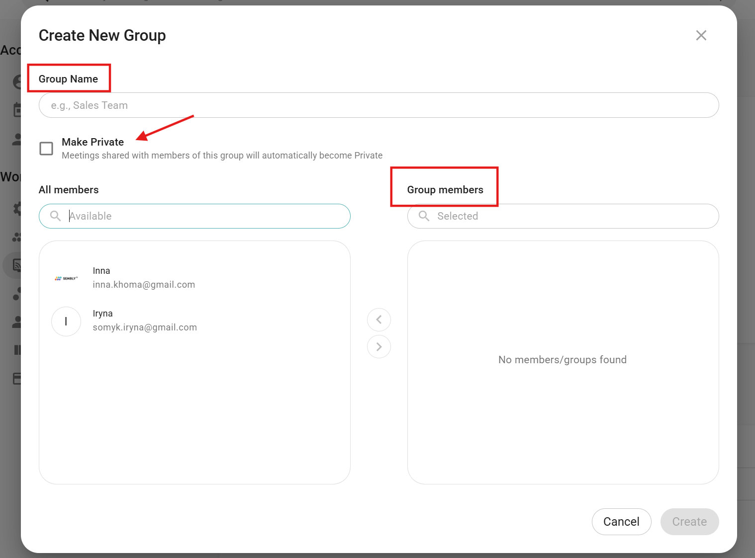 - A pop-up opens, where you can name the group, add members to it and make it Private if needed. To add members to a group, just click on any user from the All members list on the left, and they will be moved to the Group members list on the right.
