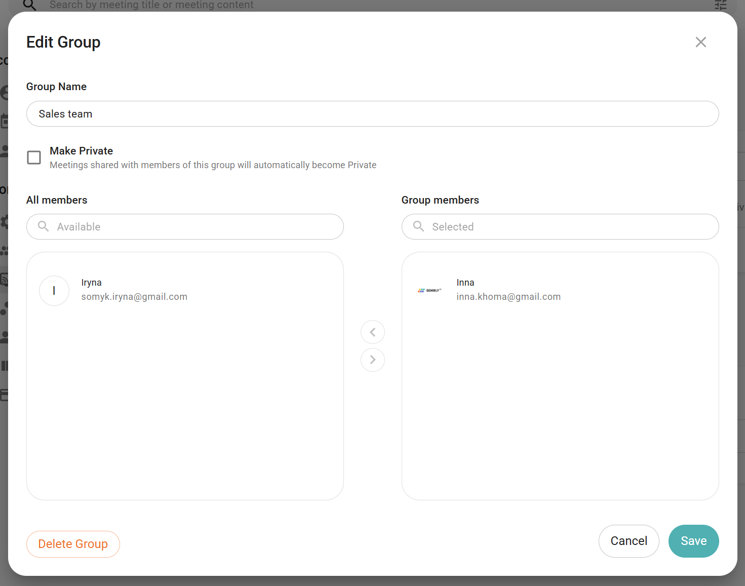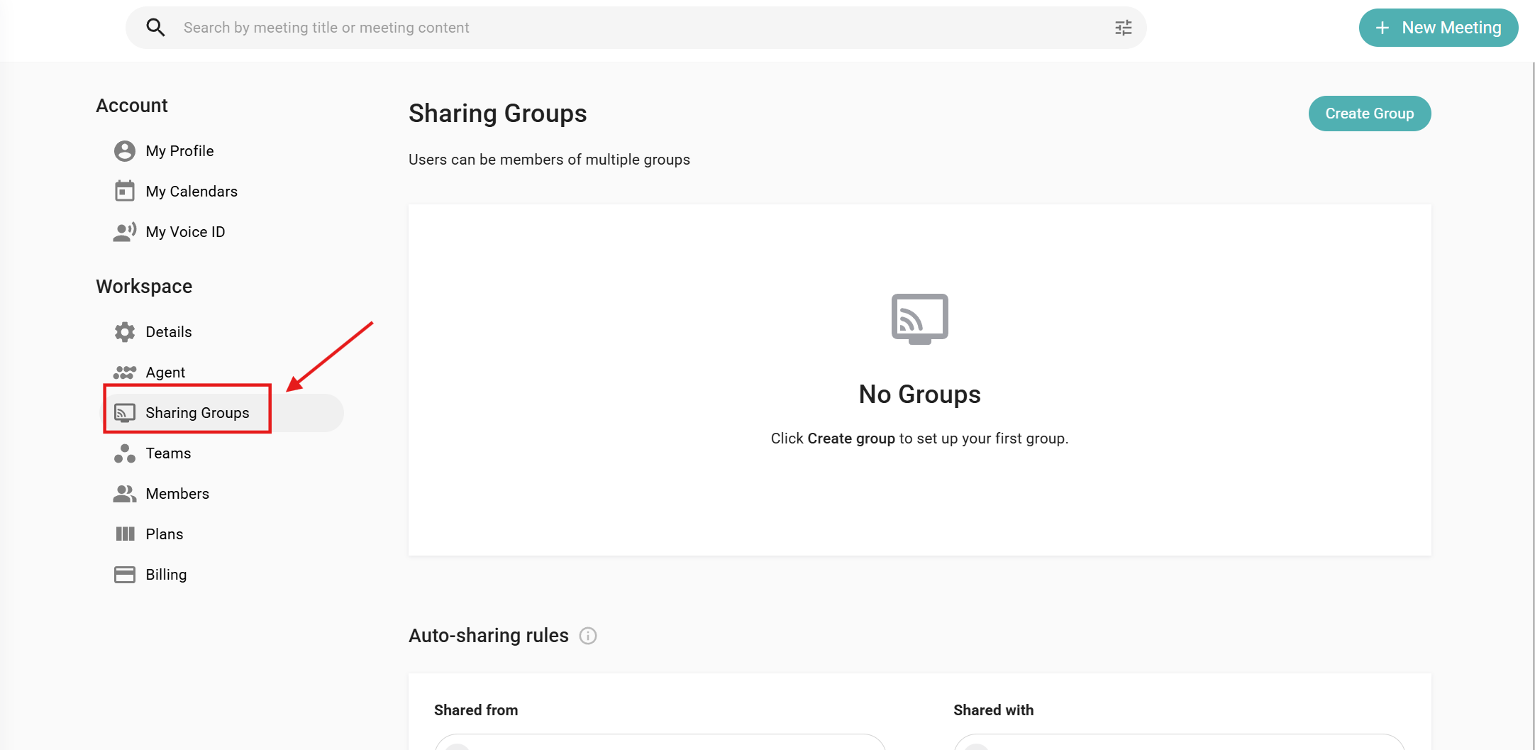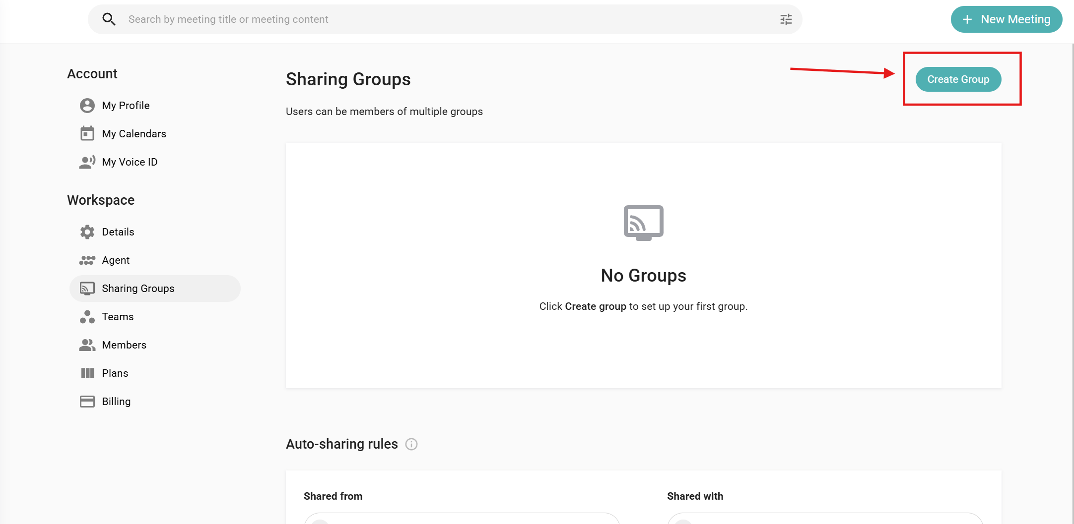 Sharing Groups allows workspace admins to organize users into user groups. Once configured, admins can define “auto-sharing” rules that automatically share users' meetings within a given group with other users or groups. Once auto-shared, the list of users with whom the meeting was shared will appear in the “Share” interface for that meeting.