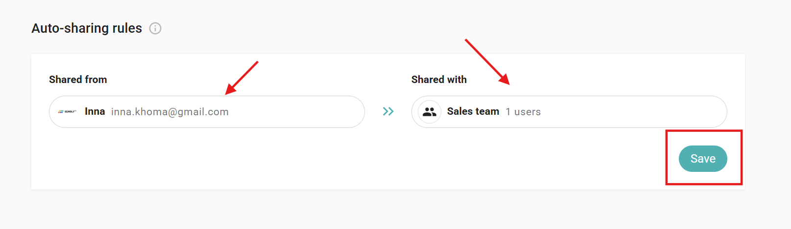 The next step is to set up the Auto-sharing rules. Choose which member or group meetings you want to auto-share with other users/groups. For example, you have a member who needs to share customer interview meetings with the Sales team. You simply choose the appropriate user and choose who their meetings will be shared with. After you are done with your selection, please press the Save button.