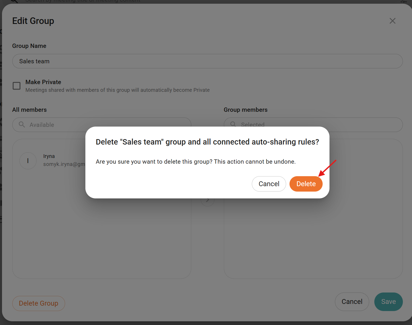 - After you press the Delete button, the Group will be removed, along with the Auto-sharing rules that were set up with it.