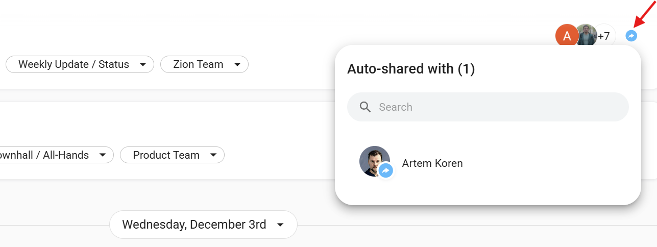 7. All new completed meetings in the Meetings list that fit the auto-sharing rules will have a small blue icon on the right side of them. When hovering over the icon, you will see who the meeting will be auto-shared with.