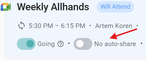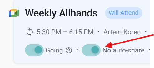 On the meeting list, toggle the No auto-share button ON if you do not wish to share the meeting.