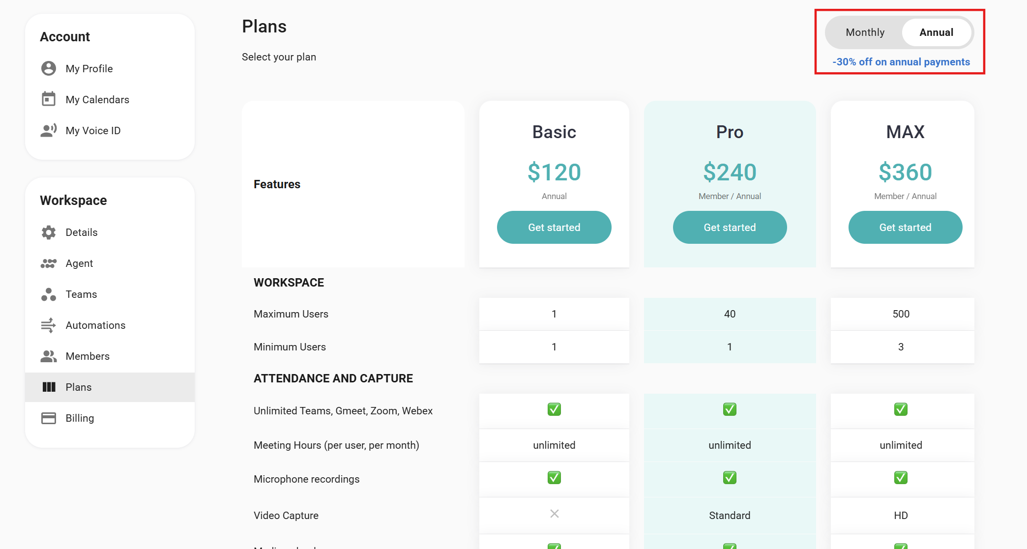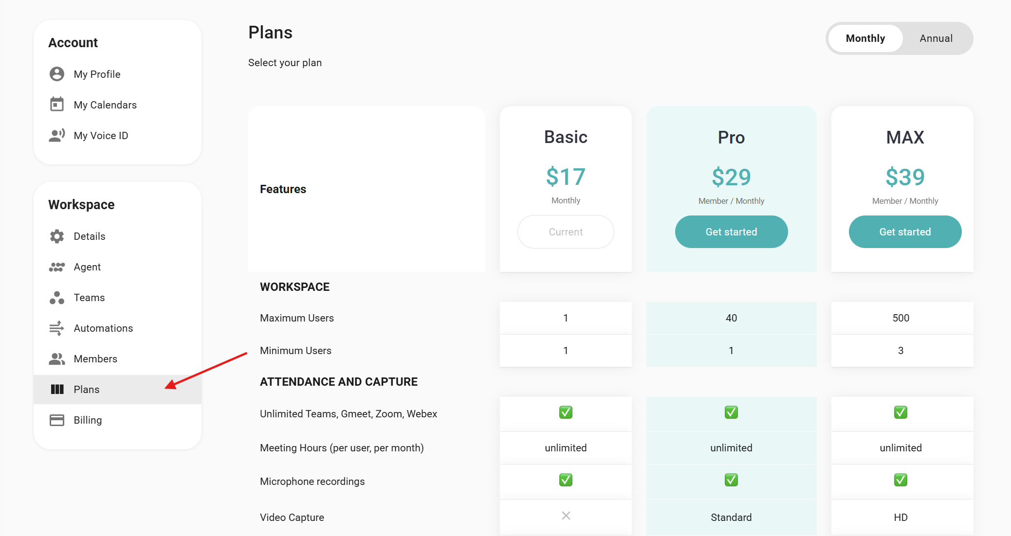 In the Plans section, you can view each plan's features and the monthly/yearly price.